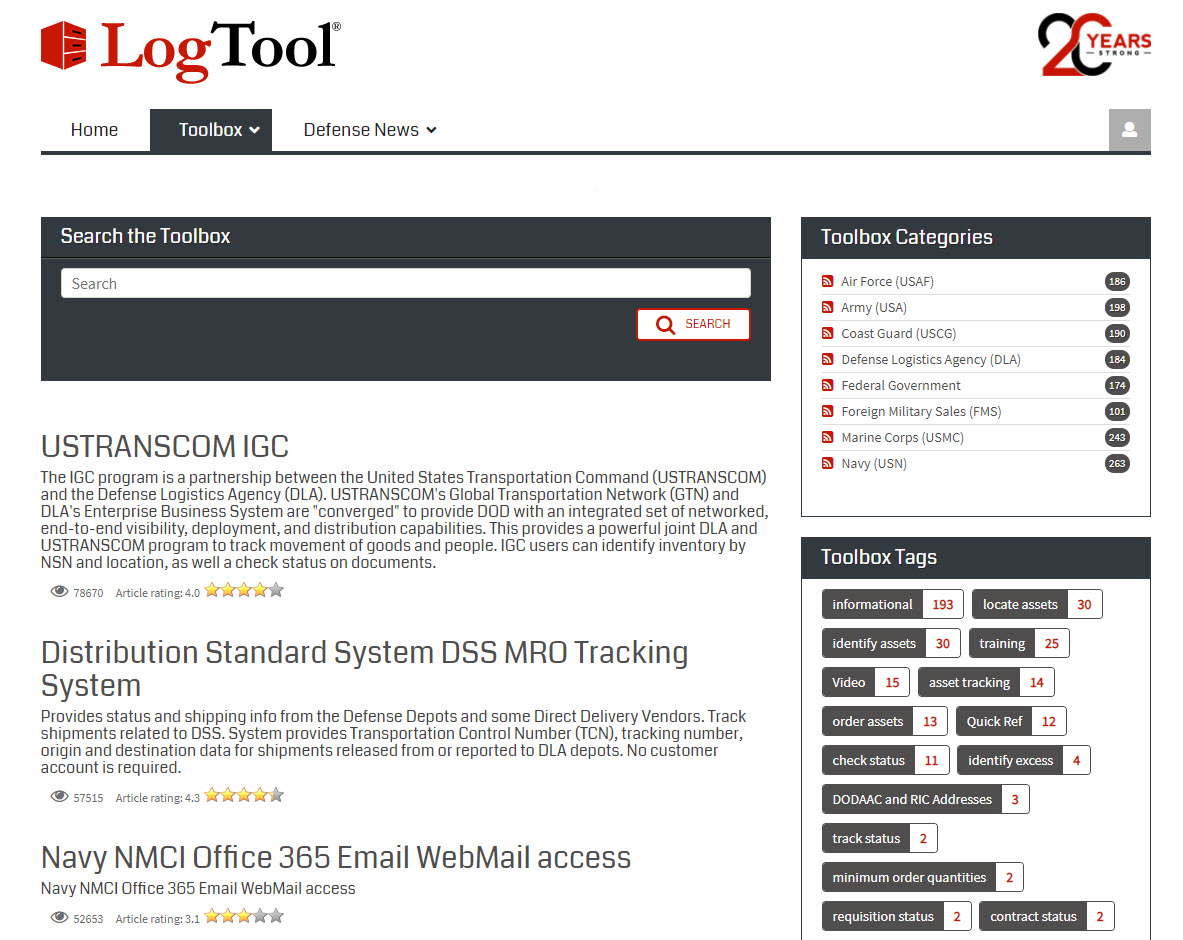Logistics Toolbox is an outstanding logistics resource locator with links to hundreds of Department of Defense, government and commercial web sites that facilitate the customer's logistics needs. From LogTool, users can click on tabs to Identify Items (technical screening), Check Assets (stock check), Order Material/Services (requisitioning) and Track Status (check status). Through this total asset visibility (TAV) portal, logisticians can access many of DLA's resources. This site also identifies other government and commercial sites providing information that may affect the logistics community's ability to support customers, such as geography, weather, medical and political resources. Also available at this site are newsletters, training and briefings. Today, many logistics systems within Department of Defense (DoD) have unique names and, unless you know where to find the information, it may be difficult to determine the type of data the systems provide until you understand some basics. Having a general understanding of the supply system and the way each of the Services perform logistics, LogTool is the best place to find the right site.